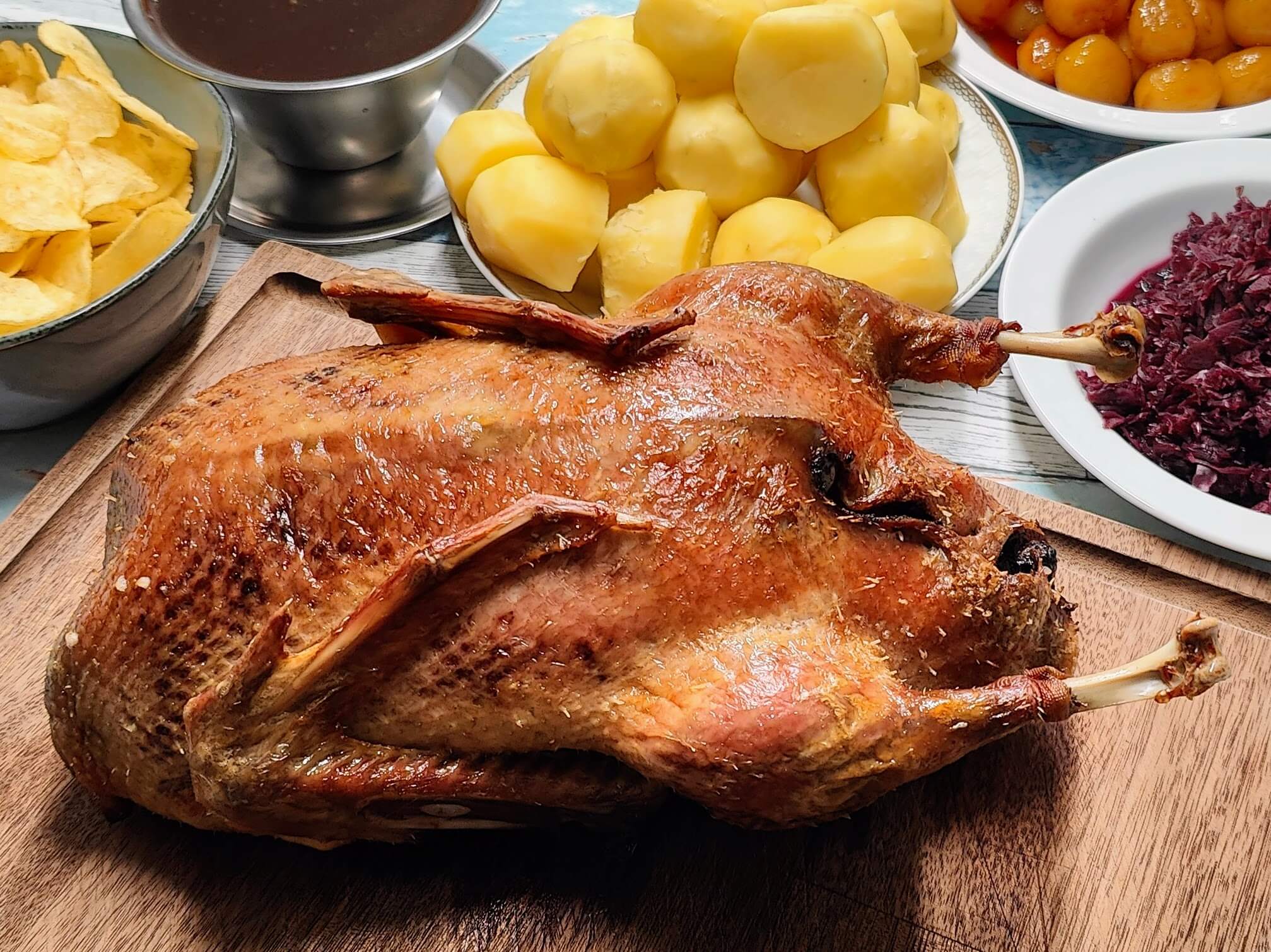 Vi har også lavet både and og flæskesteg. Så laver vi ænderne først og flæskestegen bagefter. Så står anden og hviler på køkkenbordet nogle timer. Det tager den ikke skade af. Den bliver selvfølgelig lunken. Det gør dog ikke så meget. Den smager stadig lækkert.