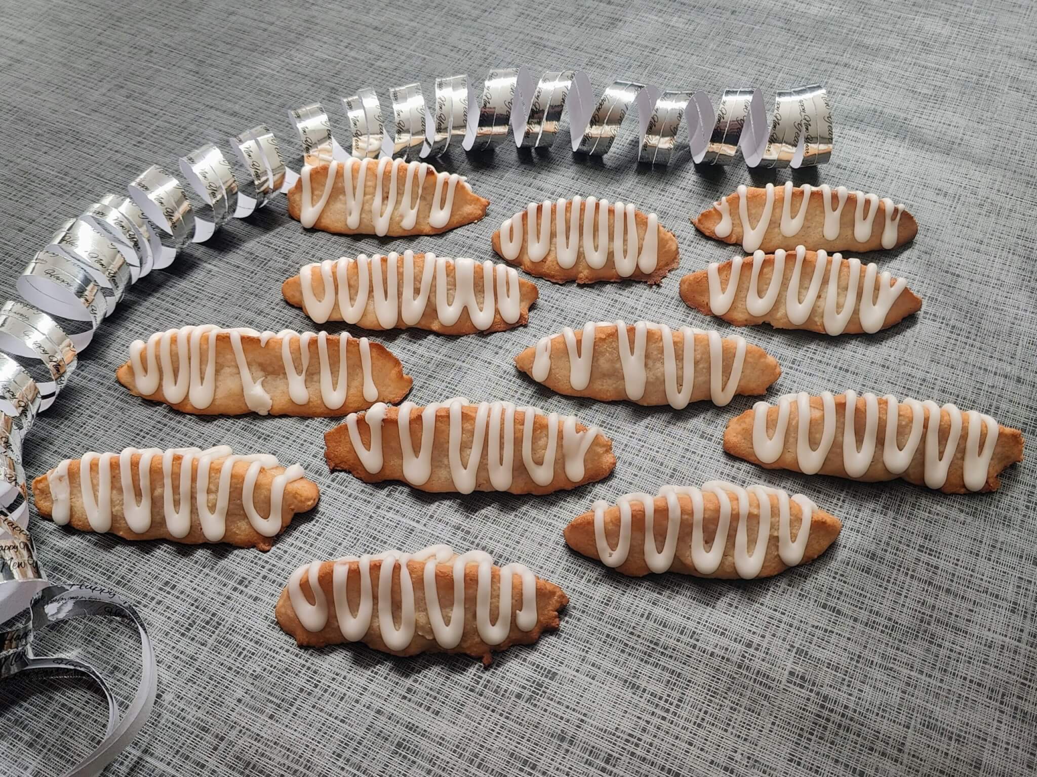 - Flormelis og æggehvide røres sammen til en tyk glasur. Hæld glasuren i en sprøjtepose og pynt de afkølede kransekager med tynde striber.