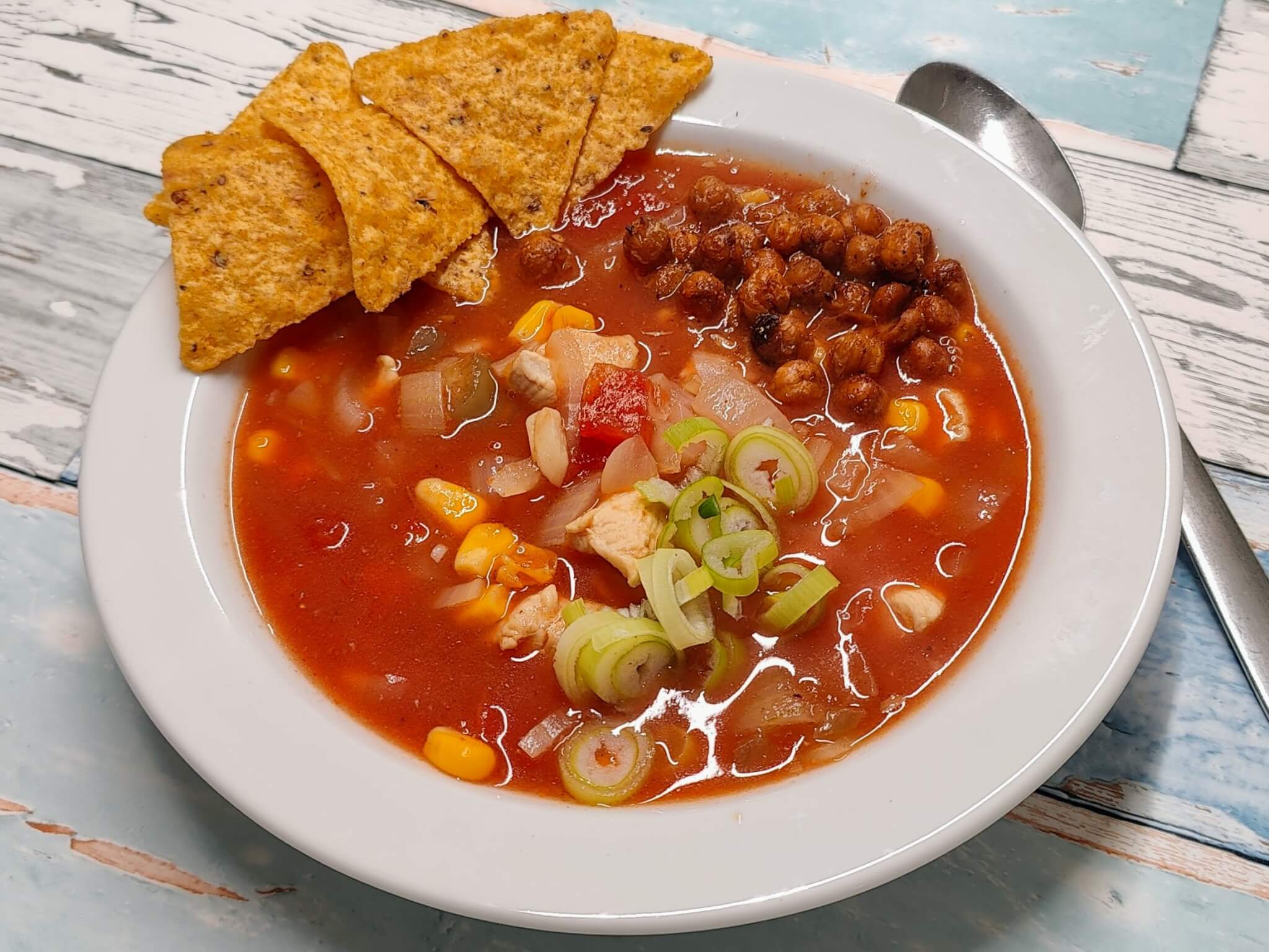 De sprøde kikærter bages i ovnen med paprika, chili, oregano og hvidløgspulver, så de bliver gyldne og knasende. De fungerer både som topping og som smagsgiver, der giver retten kontrast til den varme suppe. Server retten med tortilla chips for ekstra crunch og et mere autentisk mexicansk udtryk.