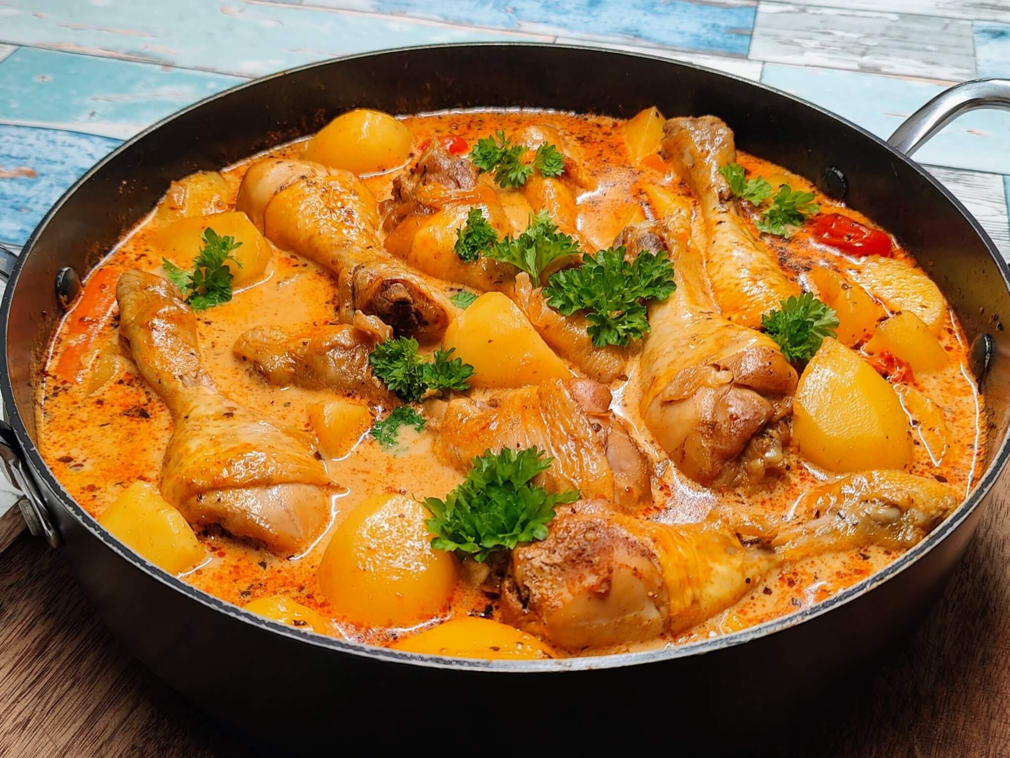 One pot med kyllingelår og kartofler er en nem og smagfuld gryderet, hvor hele middagen tilberedes i én og samme pande. De marinerede kyllingeunderlår giver retten en dyb og krydret smag, mens kartofler, gulerødder og cherrytomater suger den cremede sauce til sig under tilberedningen. Det gør retten både mættende og fuld af komfort, perfekt til både hverdagsmad og weekendforkælelse.
